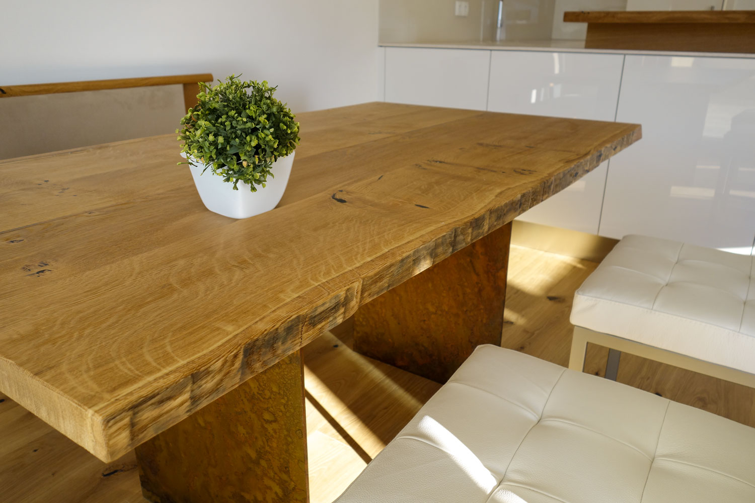 Kleine Couchtische oder große Esstische, Tischplatten von widerstandsfähiger und robuster HPL-Beschichtung, mit Echtholz furniert oder massive Leimholzplatten – geölt oder lackiert – Holzwangen, Kufen oder gleich ein Gestell nach eigenen Vorstellungen vom Schlosser gebaut und pulverbeschichtet. Sie sind sich nicht sicher wegen der Größe? Fragen Sie uns!